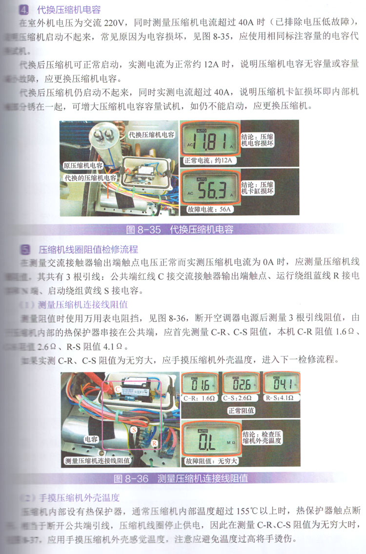 1、检查室外风扇有无异物卡住,2、测量室外风机电压电流,3、测量室外风机线圈阻值,4、测量或代换室外风机电容